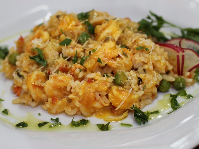 Temperar os camarões com limão, sal e pimenta-do-reino. Reservar. Em uma panela colocar o azeite e refogar o alho e a cebola. Acrescentar o tomate, o pimentão, o coentro e a cebolinha. Refogar mais um pouco (colocar mais azeite se achar necessário), incorporar o molho de tomate e cozinhar em fogo baixo até que as verduras estejam bem macias. Colocar o leite de coco, o açafrão e em seguida os camarões. Quando estiverem cozidos, acrescentar as ervilhas e o queijo ralado. Misturar o arroz ao ensopado do camarão, tendo o cuidado de deixar bem molhado. Servir em travessa ou pratos individuais. Finalizar com queijo ralado, salsinha picada e fios de azeite.