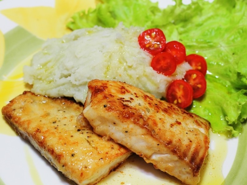 Descascar a batata doce, machucar bem com uma garfo ou passsar por um espremerdor de batata e colocar numa panela. Acrescentar o leite, desmanchar bem até ficar cremoso e finalizar com a manteiga e uma pitada de sal. Reservar. Temperar o filé com limão, sal e pimenta-do-reino. Levar ao fogo uma frigideira com o azeite e fritar o filé por 3 minutos no máximo de cada lado. Colocar em um prato acompanhadao do Purê de Batata Doce e salada de alface e tomate cereja.
