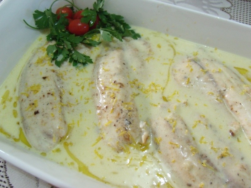Temperar os filés com suco de limão-siciliano, sal e pimenta-do-reino a gosto. Levar ao fogo uma frigideira grande (anti-aderente) com metade do azeite e fritar a metade dos filés (4 minutos de cada lado mais ou menos). Retirar da panela com uma escumadeira (com cuidado para não desmanchá-los) e reservar já no prato em que será servido. Repetir a operação com o restante dos filés. Juntar aos primeiros, colocar por cima o molho aquecido e as raspas do limão. Decorar a gosto e servir com arroz refogado e batatas coradas. Fica maravilhoso também, acompanhado de uma bela salada!