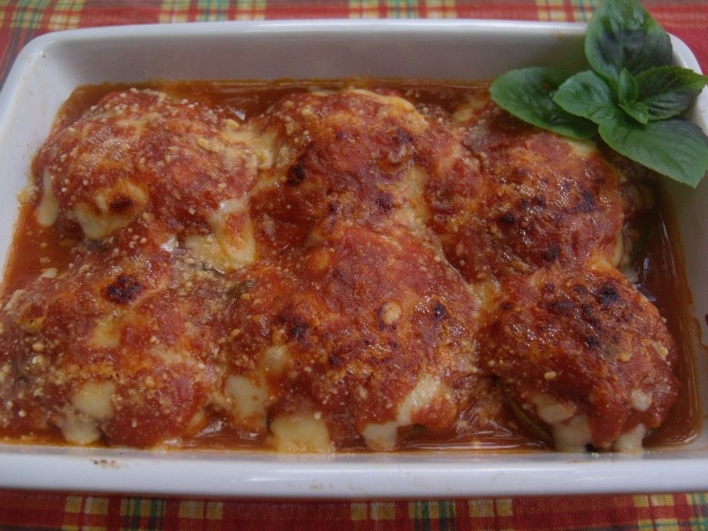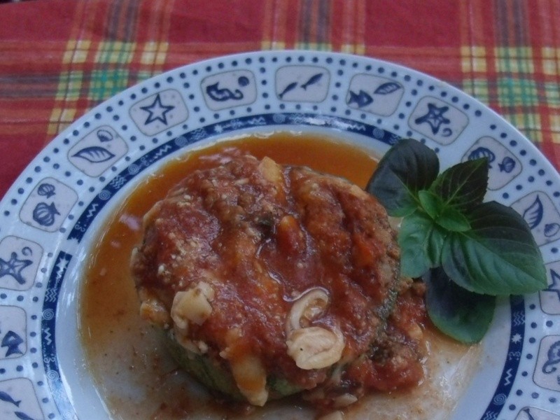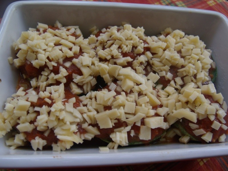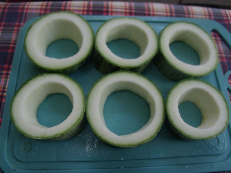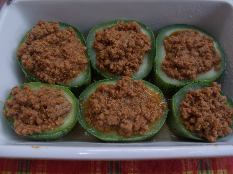 Cortar a abobrinha em rodelas de 3 cm. Retirar o miolo e cozinhar no vapor (deixar al dente). Arrumar em uma travessa refratária, rechear com carne moida, cobrir com molho de tomate, queijo mussarela picadinho, molho de tomate novamente, e por último, queijo ralado. Levar ao forno para gratinar.