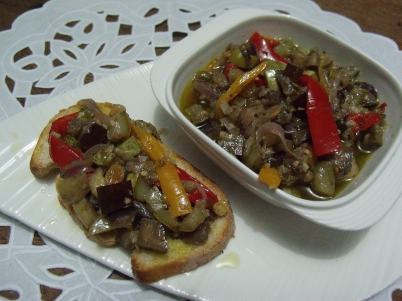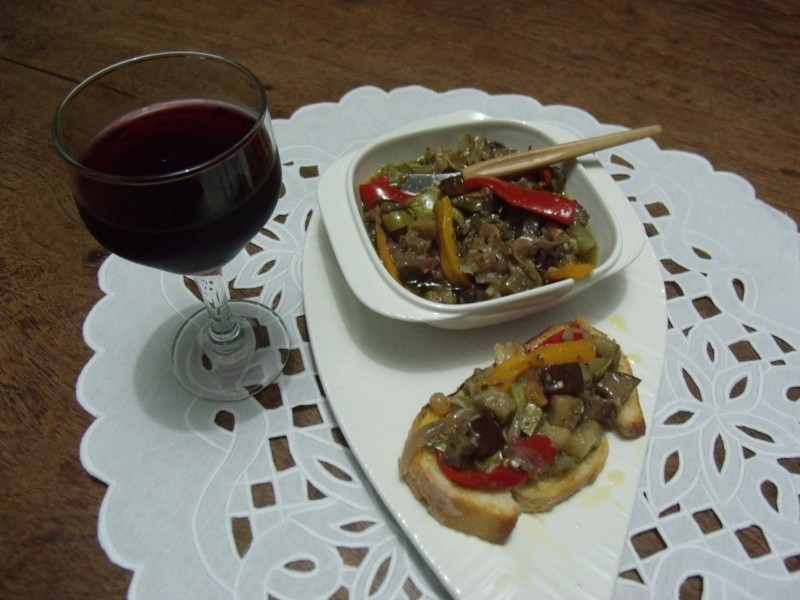 Adoro este Antepasto de Berinjela e Abobrinha! Costumo saboreá-lo com torradas de pão italiano e um bom vinho. É ideal como entrada ou simplesmente compondo uma mesa de petiscos. Delicioso!