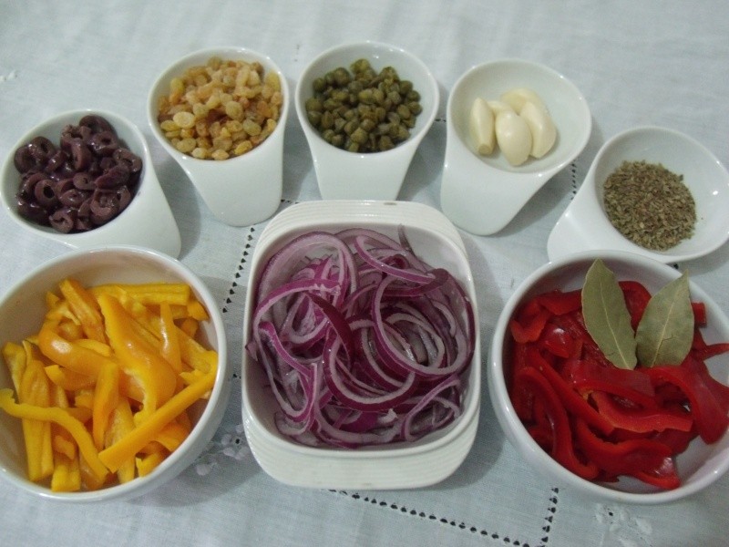 Lavar bem as abobrinhas e as berinjelas e deixá-las por 20 minutos no hipoclorito. Após esse tempo, lavar em água corrente, cortar em tirinhas e depois em cubos pequenos. Cozinhar no vapor separadamente e reservar. Em uma panela grande, colocar a metade do azeite e refogar o alho bem picadinho, as cebolas em rodelas finas e os pimentões em tirinhas, até que eles fiquem bem macios. Acrescentar as azeitonas (sem caroço), as uvas passas, o vinagre, as alcaparras, as folhas de louro, o orégano, a pimenta calabresa e sal a gosto. Refogar mais um pouco e colocar as abobrinhas, as berinjelas e o restante do azeite. Deixar esfriar e colocar em potes de vidro, conservando na geladeira. Pode ser servido quente (aquecer no micro por 20 seg) ou gelado, acompanhado de torradas. Hoje, eu fiz torradas com pão italiano. Ficou divino!