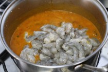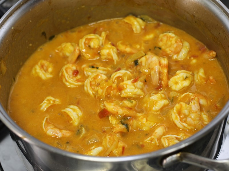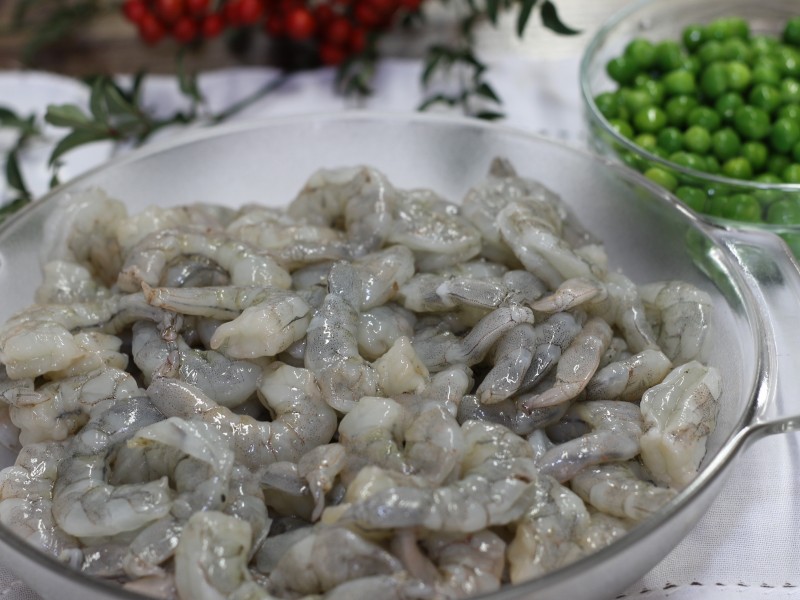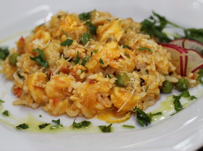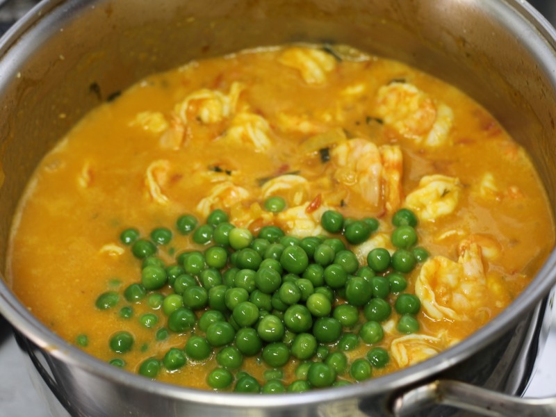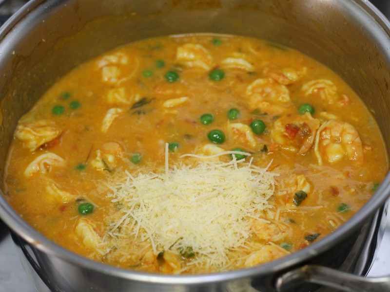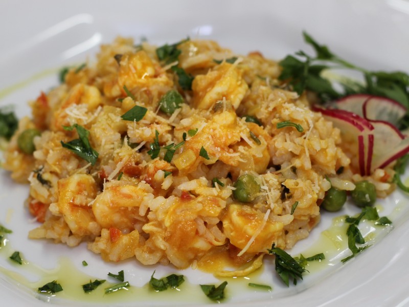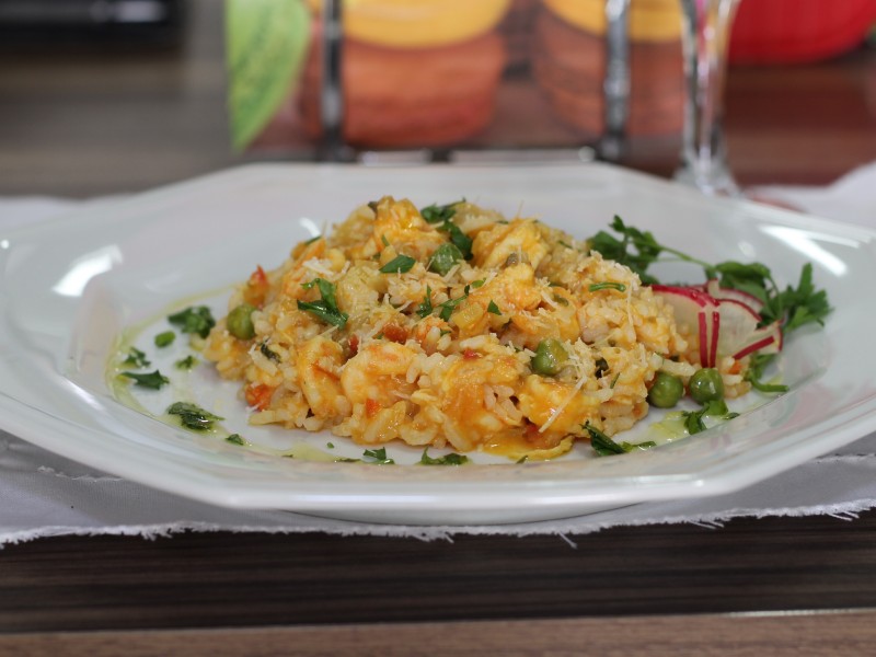 Temperar os camarões com limão, sal e pimenta-do-reino. Reservar. Em uma panela colocar o azeite e refogar o alho e a cebola. Acrescentar o tomate, o pimentão, o coentro e a cebolinha. Refogar mais um pouco (colocar mais azeite se achar necessário), incorporar o molho de tomate e cozinhar em fogo baixo até que as verduras estejam bem macias. Colocar o leite de coco, o açafrão e em seguida os camarões. Quando estiverem cozidos, acrescentar as ervilhas e o queijo ralado. Misturar o arroz ao ensopado do camarão, tendo o cuidado de deixar bem molhado. Servir em travessa ou pratos individuais. Finalizar com queijo ralado, salsinha picada e fios de azeite.