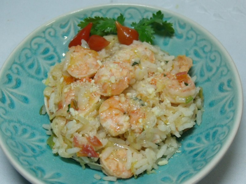 Temperar o camarão com limão, sal, pimenta-do-reino e reservar. Em uma panela (de preferência antiaderente), aquecer o azeite e refogar o alho poró e os dentes de alho esmagados. Em seguida, acrescentar o tomate, a cebola e o pimentão. Refogar e incorporar o vinho branco. Deixar evaporar um pouco e colocar agora os camarões. Polvilhar o curry, mexer e cozinhar os camarões até ficarem rosados (poucos minutos para não endurecer). Acrescentar o coentro, o arroz pronto, a manteiga e o queijo ralado. Misturar cuidadosamente e servir imediatamente em uma travessa ou em porções individuais. Regar com azeite e polvilhar queijo ralado. Decorar com folhas verdes e pimenta biquinho.