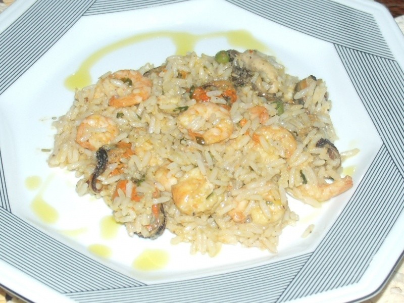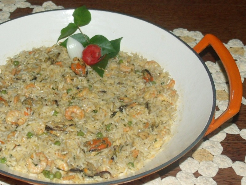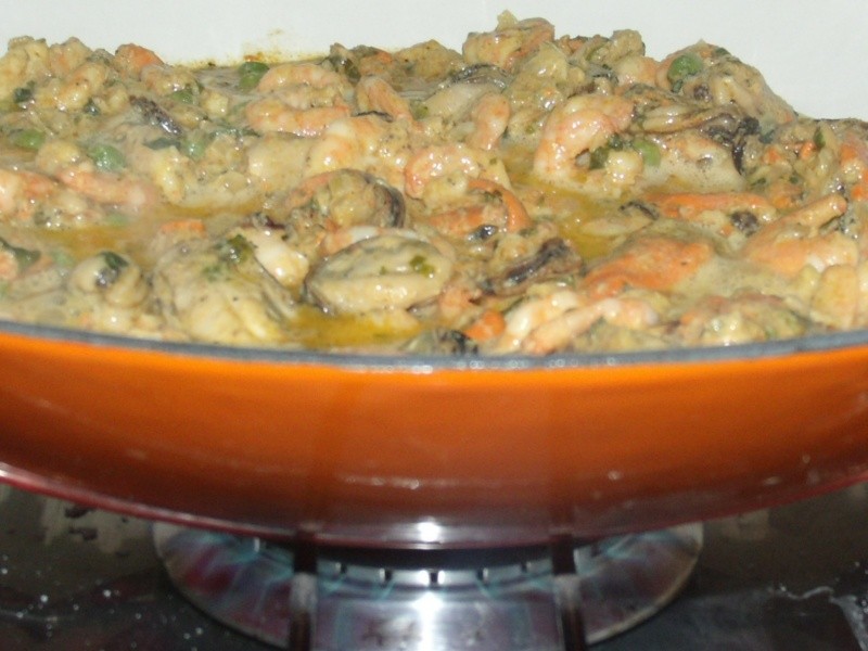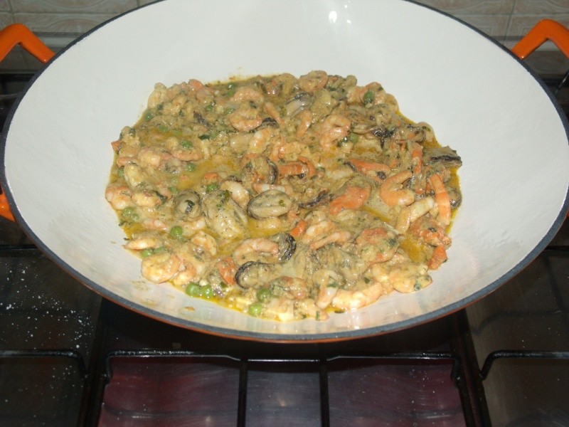 Em uma panela apropriada para risotos ou paellas, levar ao fogo o azeite e refogar o alho e a cebola até que ela fique transparente. Acrescentar os tomates, o pimentão, o coentro, a cebolinha e a pimenta de cheiro. Refogar e colocar um pouco de água, o curry e as ervilhas. Baixar o fogo para que cozinhe sem secar o caldo. À parte, temperar os camarões com sal e limão e dar uma selada no azeite (fritar ligeiramente), retirando-os do fogo assim que eles ficarem rosados (pode acrescentar uma colherinha de manteiga para dar mais sabor). Juntar ao molho da panela, incorporar os mexilhões e temperar com sal e piment-do-reino. Desligar uns 5 minutos após levantar fervura. Misturar o arroz refogado (que deve estar quente), decorar a gosto e servir imediatamente. Bom apetite!