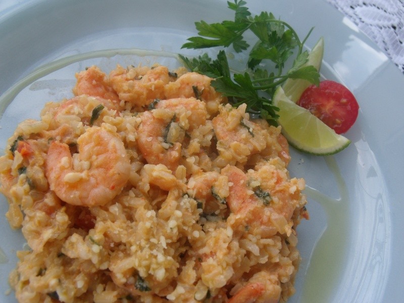 Limpar os camarões (retirar as tripinhas) e lavar com limão. Temperar com sal e pimenta-do-reino a gosto. Reservar. Levar uma panela ao fogo com o azeite e refogar o alho e a cebola (até que esta fique transparente), em seguida, colocar o purê de tomate, os tomates e o pimentão. Cozinhar em fogo baixo por aproximadamente 10 min e acrescentar o coentro, a cebolinha e os camarões. Quando este estiver cozinhado, incorporar o vinho e deixar evaporar um pouco. Colocar o creme de leite e um minutinho depois, o arroz refogado e o queijo ralado. Mexer cuidadosamente com uma colher de pau. Arrumar em uma travessa e regar com um bom azeite extra virgem. Decorar a gosto e servir com uma porção de queijo ralado à parte.