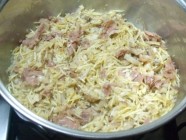 Em uma tigela, bater os ovos e temperar com sal e pimenta-do-reino a gosto. Reservar. Numa panela, refogar o alho e a cebola (até que ela fique transparente) e acrescentar o presunto de Parma em pedaços. Fritar por 1 minuto e adicionar o bacalhau em lascas. Ainda na panela, adicionar a batata palha e por último, os ovos batidos e temperados com sal (se necessário) e pimenta-do-reino. Mexer por 3 minutos e servir imediatamente, decorado com azeitonas pretas e cebolinha verde picada.