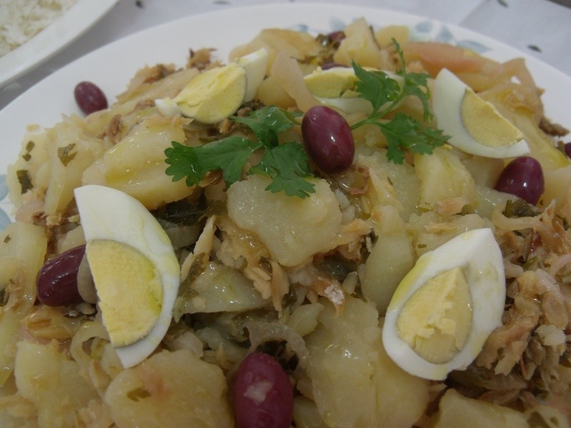 Colocar o bacalhau em uma panela com a folha de louro. Por cima, as rodelas de cebola, as batatas e o azeite misturado com o vinagre. Temperar com a pimenta-do-reino, polvilhar a salsa picada e tampar a panela. Levar ao fogo brando, sacudindo-a de vez em quando para não pegar. Colocar em um pirex e levar ao forno por pouco tempo, apenas para dar uma consistência. Servir quente, decorado com ovos cozidos e azeitonas pretas.