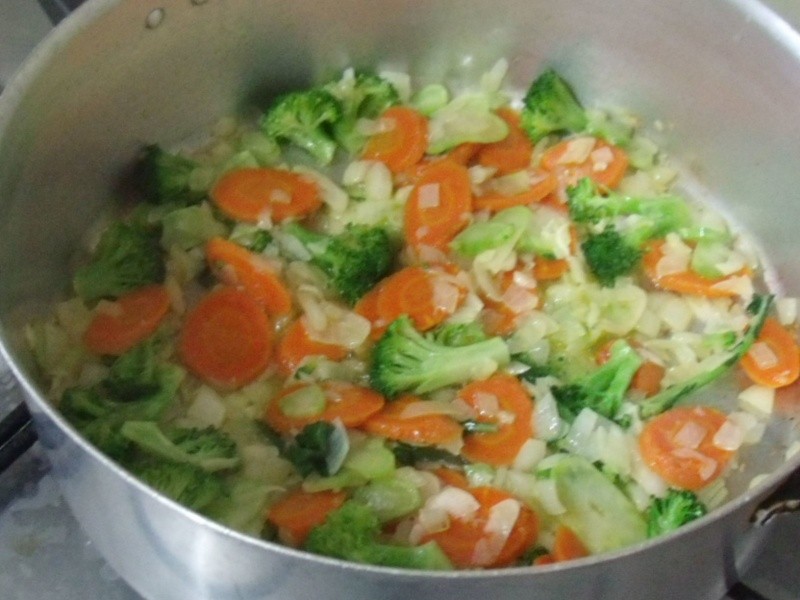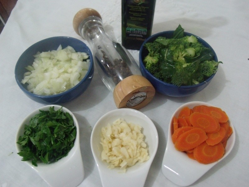 Cozinhar ligeiramente a cenoura no vapor e reservar. Separar os buquês de brócolis, fatiar os talos e reservar (utilizar também algumas folhas). Levar ao fogo uma panela com bastante azeite, refogar as cebolas e o alho. Acrescentar o brócolis, os talos e as folhas. Refogar e incorporar a cenoura em rodelas e o bacalhau. Baixar o fogo e refogar bastante (acrescentar mais azeite se necessário). Polvilhar pimenta-do-reino e acrescentar a salsa picada. Arrumar o bacalhau em um refratário e reservar. Levar ao fogo o purê com um pouco de azeite. Misturar bem, deixando com uma consistência cremosa. Despejar sobre o bacalhau, regar com um pouco de azeite e polvilhar o queijo ralado. Levar o bacalhau ao forno em temperatura alta, e deixar apenas o tempo suficiente para gratinar. Decorar com tomates cereja e ramos de salsa. Servir com arroz gratinado, salada e um vinho de sua preferência. Bom apetite!