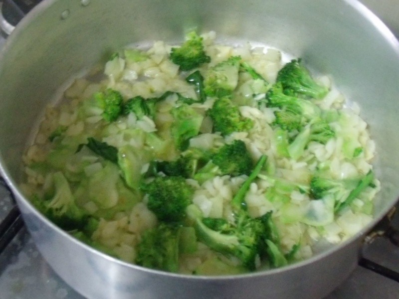 1/2 brócolis pequeno com folhas e talos fatiados