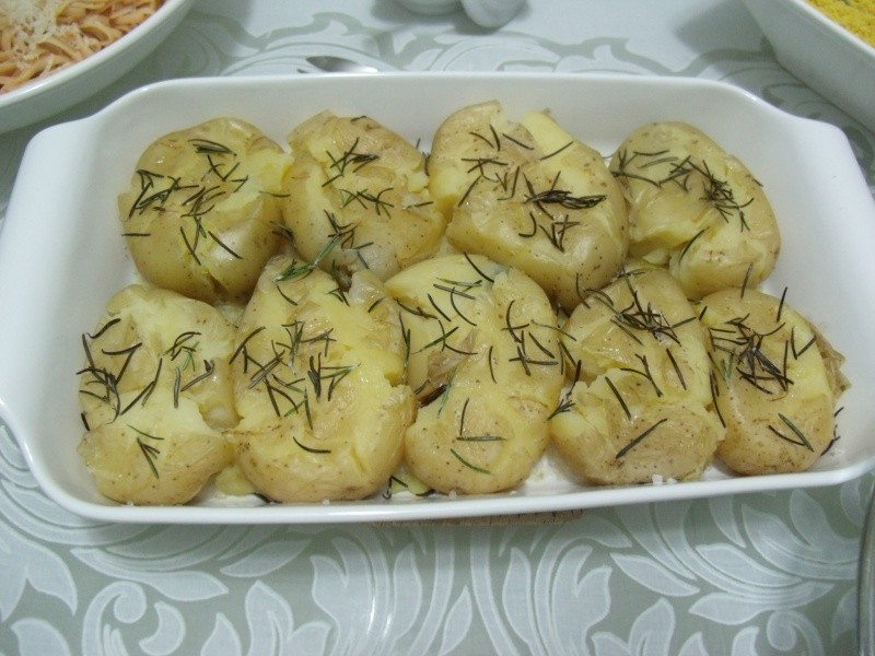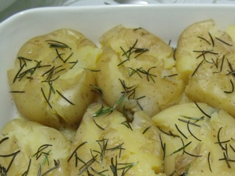 Lavar bem as batatas sem descascar e cozinhar numa panela grande em 4 litros de água, por aproximadamente 45 minutos. Após esse tempo, espetar com um garfo para ver se elas estão no ponto. Escorrer e colocar as batatas em um pano de prato limpo. Deixar esfriar um pouco e dar um murro em cada uma delas, deixando-as achatadas e “rachadas”. Forrar uma travessa refratária com sal grosso e colocar as batatas lado a lado. Salpicar mais sal grosso sobre elas, regar com bastante azeite e polvilhar alecrim a gosto. Cobrir com papel alumínio e levar ao forno pré-aquecido (180 graus) por 15 a 20 minutos (vai depender do seu forno). Retirar o papel alumínio, regar com mais um pouco de azeite (para dar aquele brilho) e servir em seguida.