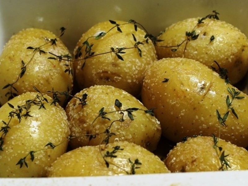Higienizar as batatas, colocar em uma panela com água e levar ao fogo para dar uma pré-cozida. Escorrer e deixar secar um pouco. Colocar em um refratário ou forma antiaderente, regar com o azeite, temperar com sal rosa moido na hora e dispor ramos de tomilho fresco sobre cada batata. Levar ao forno por 20 minutos aproximadamente (vai depender do seu forno) ou até que o tomilho esteja assado. Servir como acompanhamento de carnes e frangos.