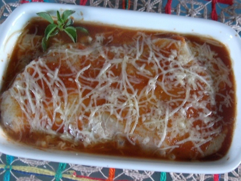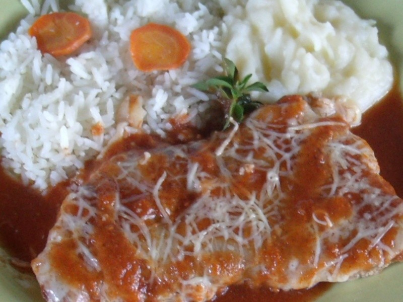 Costumo fazer com frequência esse bife à parmegiana, tanto de carne, como de frango e peixe. Dessa vez, ao sair de casa para o trabalho, pedi para a minha cozinheira Ana preparar um bife de alcatra à milanesa para o meu almoço! No meio do caminho resolvi que seria à parmgiana. Ao chegar em casa, descongelei um potinho de molho de tomate caseiro (que sempre tenho no freezer) e rapidamente preparei o meu bifinho à parmegiana!