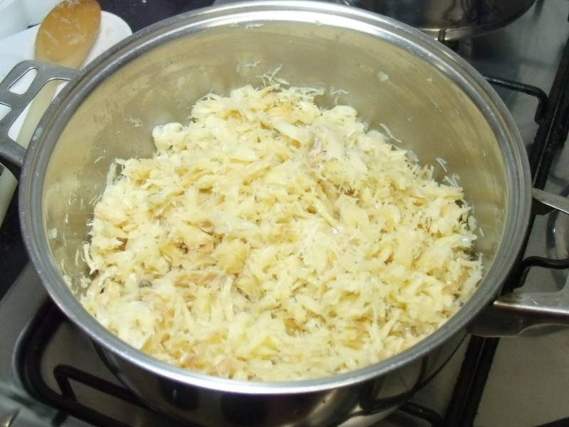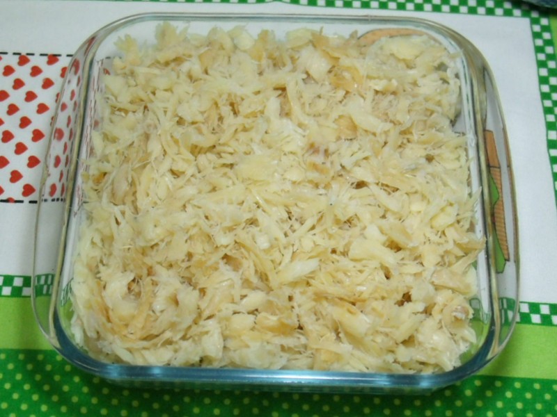 Cozinhar o bacalhau (que já esteve de molho de um dia para o outro) em uma panela com água por 5 minutos. Deixar escorrer e retirar a pele e as espinhas. Colocar em um pano limpo, enrolar bem e bater na pedra da cozinha para retirar o excesso de água. Desfiar bem miudinho e reservar.