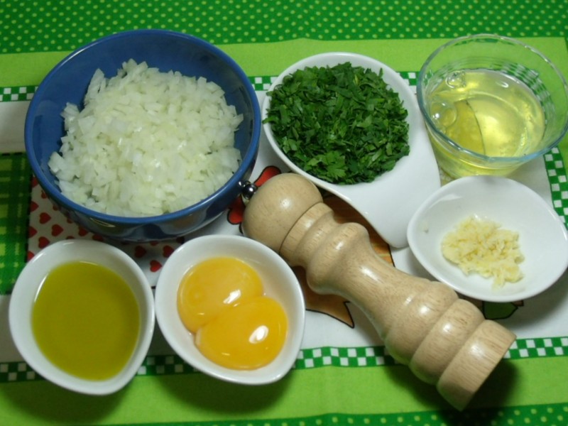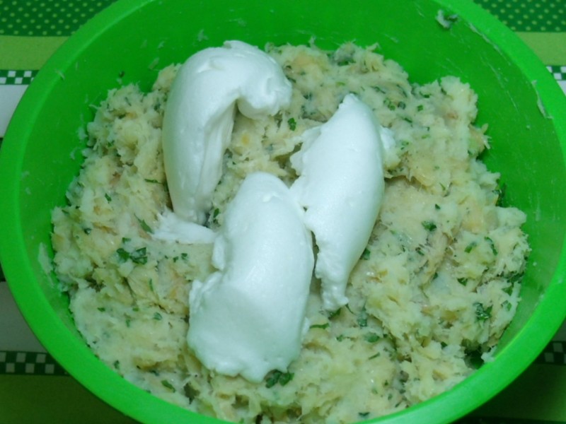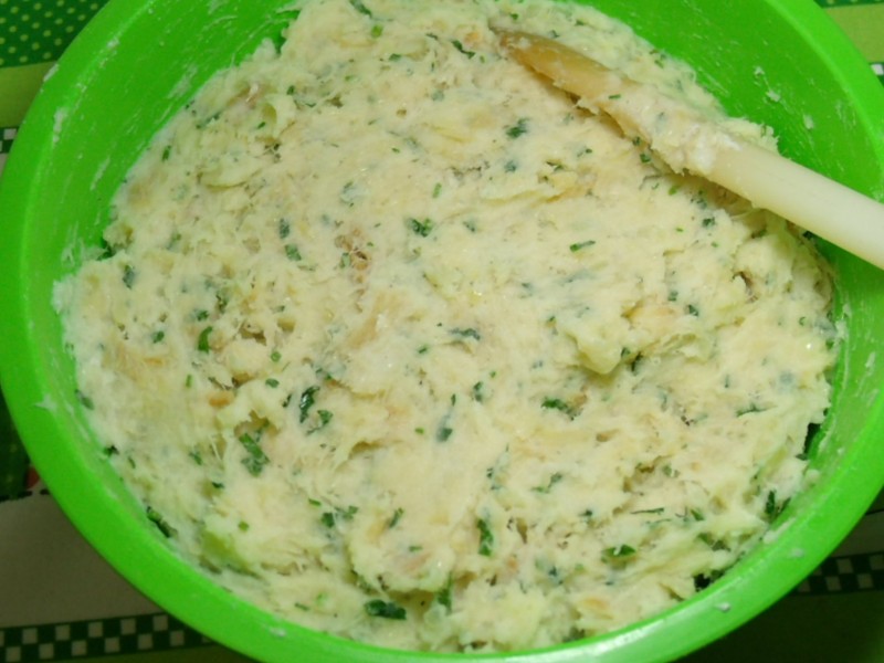 Em uma frigideira, colocar o azeite e refogar o alho e a cebola. Em seguida, colocar o bacalhau e misturar bem. Despejar na tigela das batatas e acrescentar a salsinha, as gemas e a pimenta-do-reino (se necessário, um pouco de sal). Misturar bem com uma colher de pau e por último, incorporar as claras em neve.