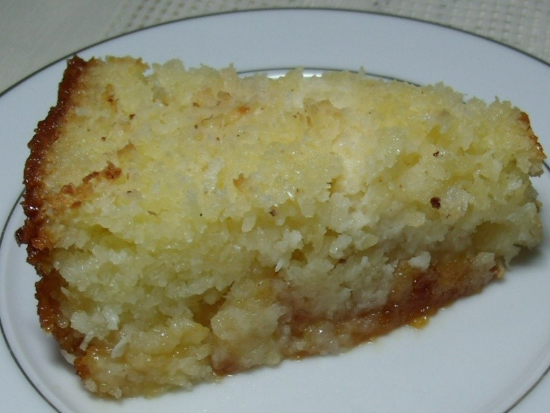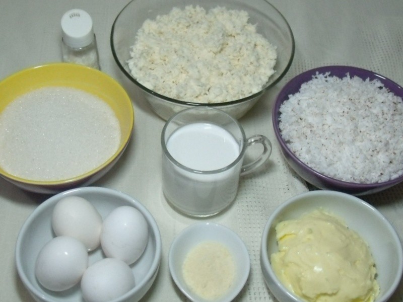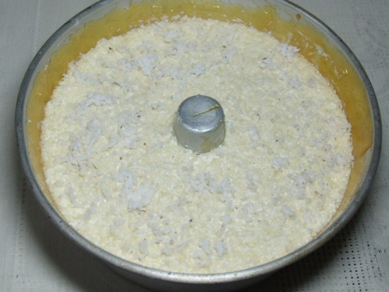 Bater os ovos, a manteiga e o açúcar CAETÉ até formar um creme. Em seguida, acrescentar os demais ingredientes e misturar (reservar 1 colher de sopa de coco ralado).