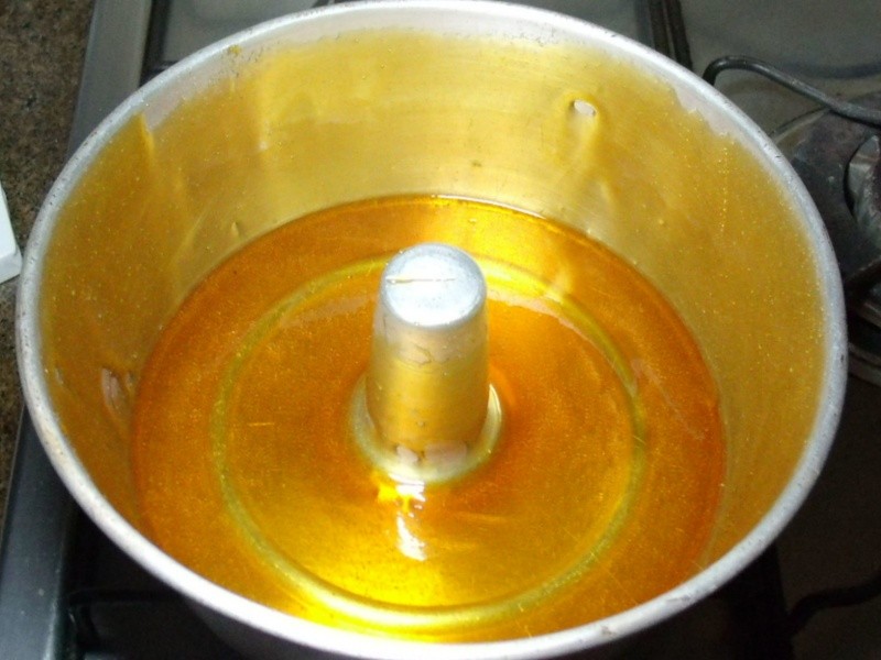 1. Caramelizar a forma de pudim e quando esfriar pincelar um pouco de margarina ou manteiga.