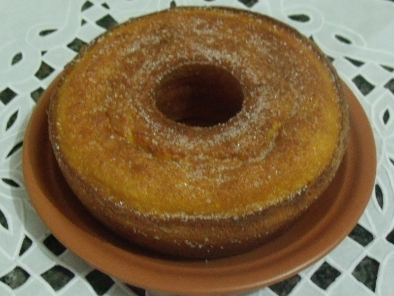 Bater todos os ingredientes no liquidificador por 3 min. Despejar em uma forma média untada com margarina. Assar em forno médio (180º) por aproximadamente 40 min. Depois de pronto, desenformar e polvilhar com açúcar e canela.