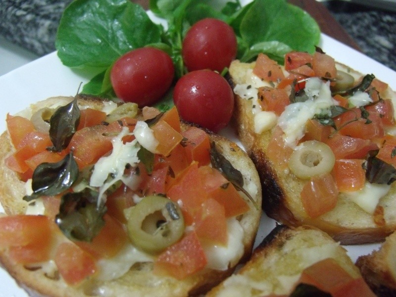 Passar manteiga ou margarina nas fatias de pão, acrescentar o alho apenas em um lado e levar ao forno para assar ligeiramentre. Após esse tempo, retirar do forno e colocar o queijo coalho, os tomates (temperados com sal e pimenta-do-reino a gosto), as azeitonas, o orégano e as folhas de manjericão. Regar com o azeite e voltar ao forno o tempo suficiente para derreter o queijo. Servir imediatamente.