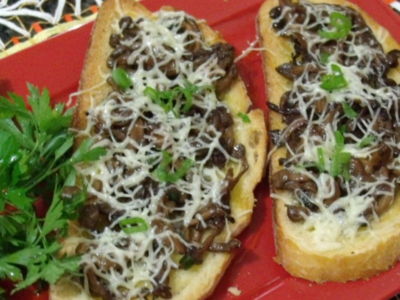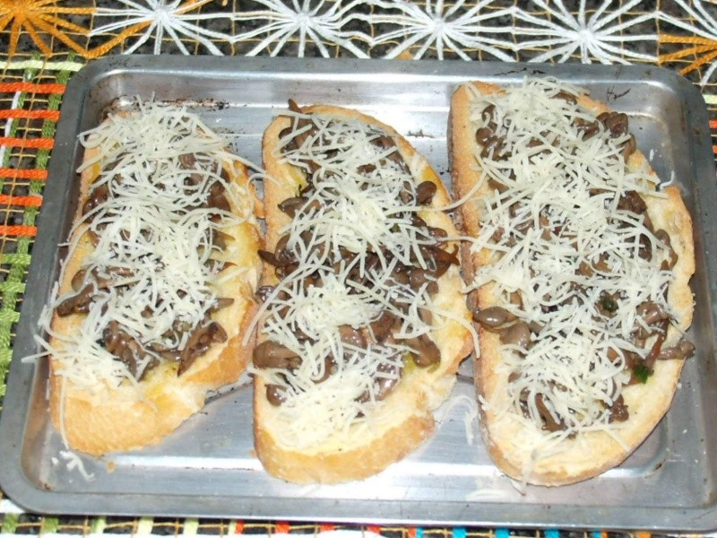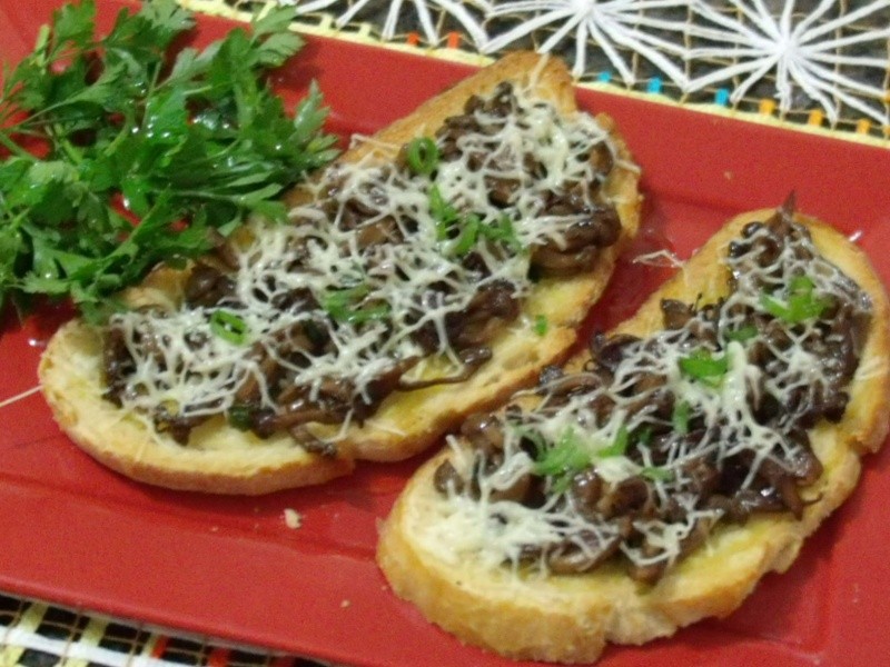 Esta foi a primeira vez que fiz a bruschetta de shimeji! Ficou uma maravilha! Não tinha como dar errado, pois as torradas de alho são padrão e o shimeji, fiz a receita básica com manteiga e shoyu que fica delicioso! O queijo montanhês ralado deu um sabor especial, pois ele é um parmesão mais macio e muito gostoso! Na Itália, o pão é tostado na grelha com basicamente azeite de boa qualidade e alho. Aqui usamos normalmente o forno, mas o azeite tem que ser o melhor!