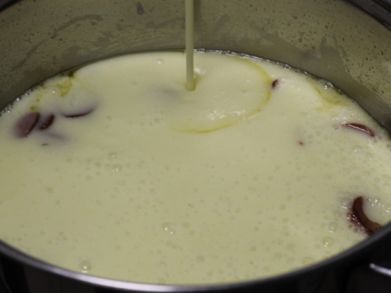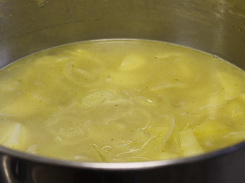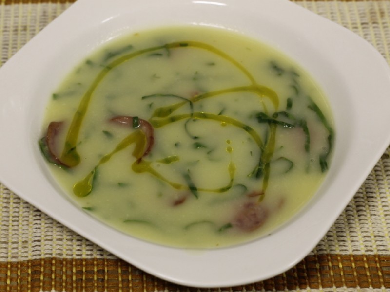 Dourar a cebola na manteiga, acrescentar as batatas, o caldo de carne e cobrir de água. Cozinhar as batatas, até que eles fiquem bem macias (aproximadamente 30 minutos). Bater no liquidificador e reservar. Em uma panela, colocar 1 fio de azeite e refogar ligeiramente a linguiça em rodelas. Acrescentar o caldo do liquidificador e a couve (retirar os talos, fazer rolinhos e cortar o mais fino possível). Deixar ferver por 10 minutos em fogo baixo. Quando servir, regar com um fio de azeite extra virgem e acompanhar de pão fresco ou torradas.
