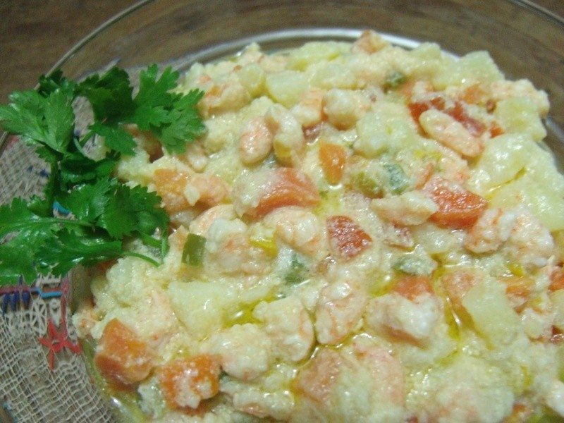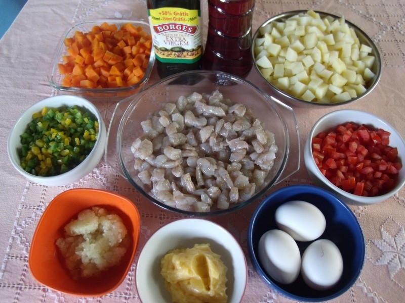 Temperar o camarão com sal e limão. Reservar. Cozinhar separadamente as batatas e as cenouras. Escorrer e reservar. Fazer um molho com o vinagre, o azeite, o sal e a pimenta-do-reino. Colocar em um recipiente os camarões, as batatas, as cenouras, os pimentões, os tomates e a cebola ralada. Regar com o molho e incorporar os ovos. Misturar tudo muito bem e deixar tomando gosto por 30 minutos. Levar ao fogo a manteiga com o azeite. Quando ferver, acrescentar os camarões com as verduras temperadas. Mexer sempre, até os camarões cozinharem. Servir gelado.
