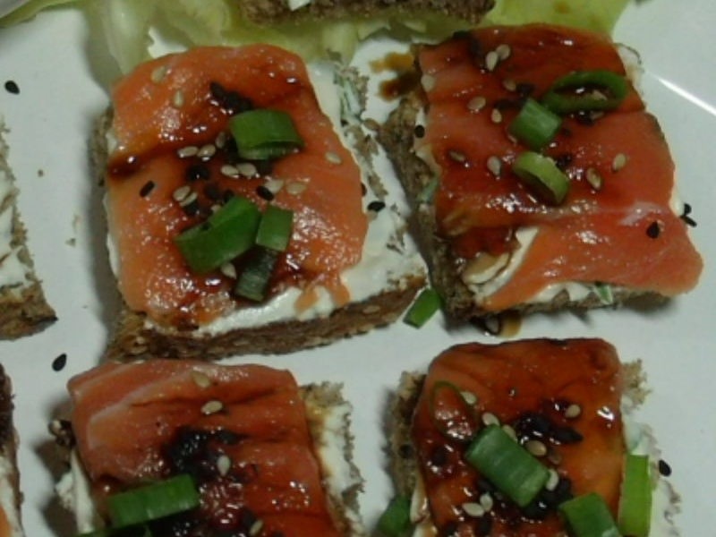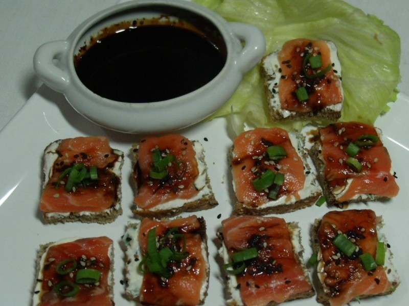 Vi em uma revista uns canapés de salmão e cream cheese e resolvi fazê-los. Acrescentei gergelim e cebolinha verde, o que deixou os canapés com um sabor e visual irresistíveis! Me arrisquei a preparar o molho teriyaki que adoro e ficou simplesmente maravilhoso! Para quem gosta de salmão cru, é uma boa pedida.