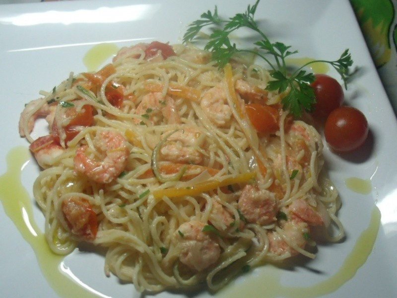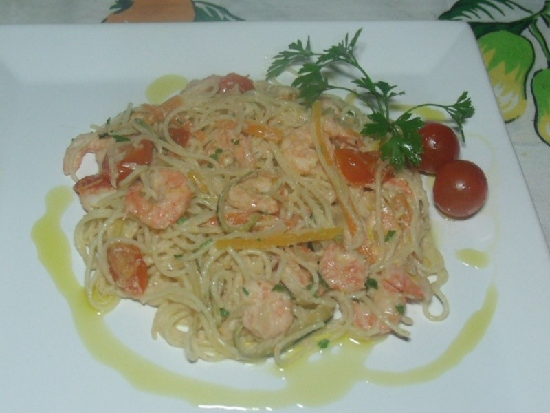 Temperar os camarões com sal e azeite. Reservar. Levar ao fogo uma panela com 4 l de água e cozinhar a massa conforme instrução da embalagem. Temperar com sal . Enquanto isso, aquecer uma frigideira e derreter a manteiga (coloquei também 1 fio de azeite). Baixar o fogo, incorporar a cebola e a cenoura “branqueada” e cozinhar por 2 minutos. Colocar a abobrinha e cozinhar por mais 2 minutos. Aumentar o fogo e adicionar os camarões, o suco e as raspas de limão siciliano, o vinho branco, os tomatinhos cereja, a páprica picante e o sal. Mexer bem e quando os camarões ficarem rosados, acrescentar o creme de leite e o parmesão. Mexer e deixar reduzir um pouco. Adicionar o Capellini “al dente “, misturar e servir em seguida polvilhado com salsa picada. Acompanhar de queijo ralado grosso à parte.