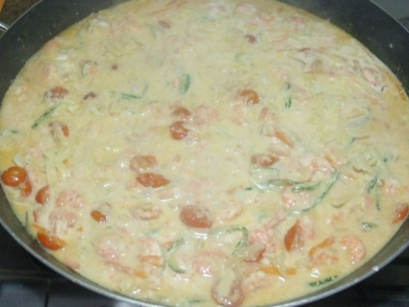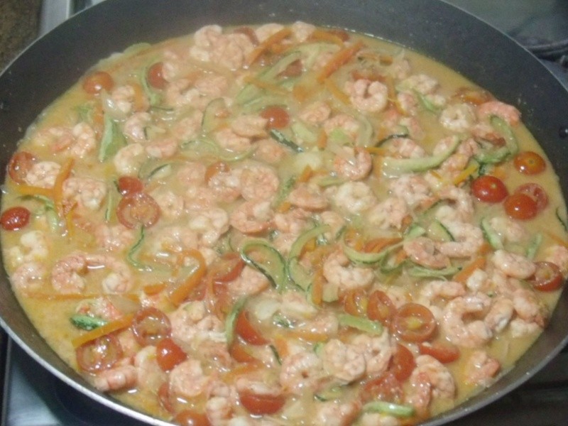 Há tempo eu queria fazer uma massa com camarão e abobrinha, assim surgiu esse prato que ficou delicioso! A dica que dou é que a massa deve ser escorrida e imediatamente incorporada ao molho (reservar sempre um pouco da água do cozimento do macarrão, caso seja necessário deixar o molho mais líquido).