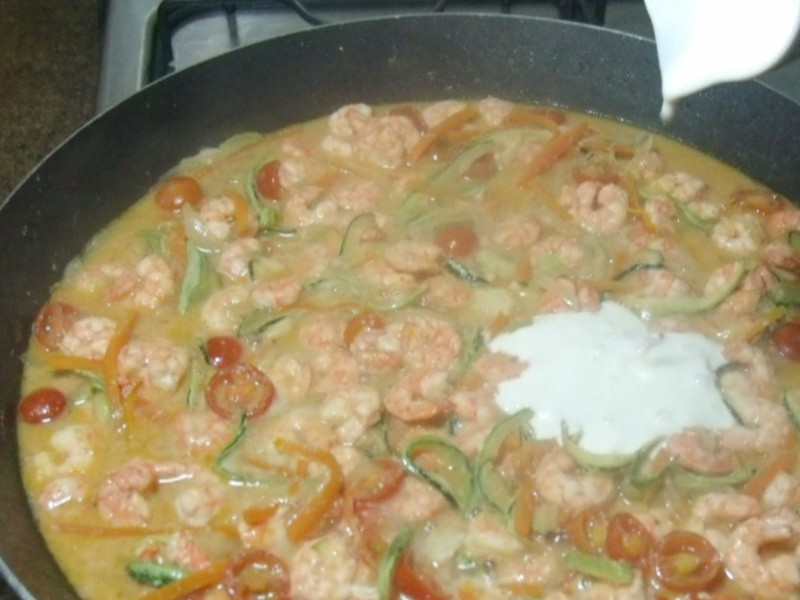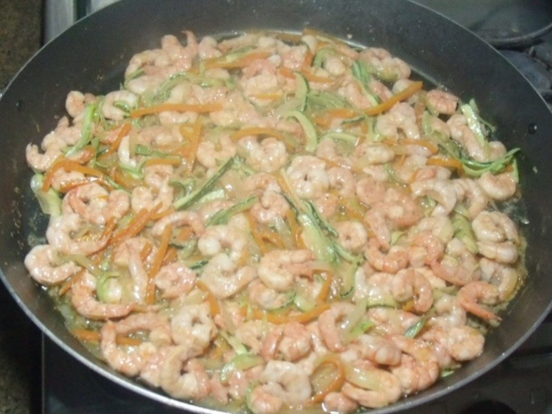 Há tempo eu queria fazer uma massa com camarão e abobrinha, assim surgiu esse prato que ficou delicioso! A dica que dou é que a massa deve ser escorrida e imediatamente incorporada ao molho (reservar sempre um pouco da água do cozimento do macarrão, caso seja necessário deixar o molho mais líquido).