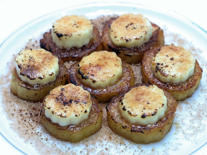 Cortar fatias de queijo coalho com 1/2 cm de espessura. Com o auxílio de cortadores de biscoitos, cortar as "florzinhas" de queijo em número igual às rodelas de banana também com 1/2 cm de espessura. Reservar. Aquecer a manteiga numa frigideira e fritar as rodelas das bananas dos dois lados. Retirar do fogo e colocar em pratos individuais. Polvilhar com o açúcar misturado com a canela, dispor por cima as "florzinhas" de queijo, polvilhar com mais açúcar e canela e usar o maçarico culinário para finalizar dando uma tostada. Servir em seguida para que seja consumida bem quentinha.