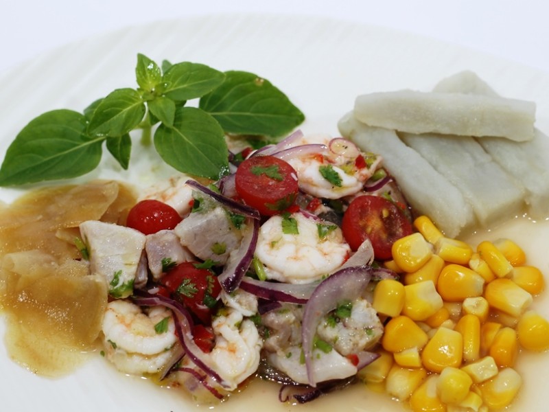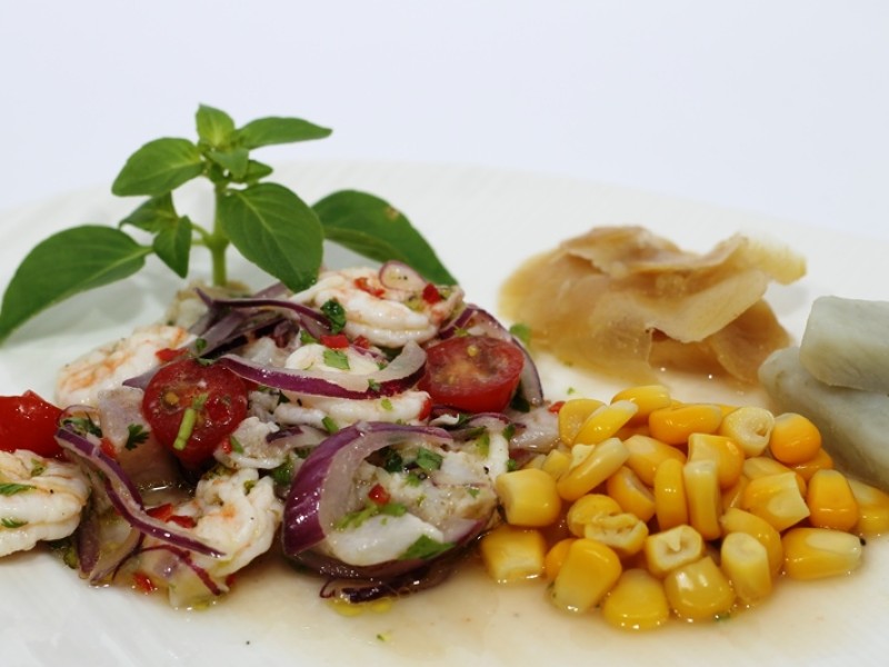O Ceviche de Camarão é um dos mais tradicionais do Equador. Acrescentei filé de tilápia e substitui o tomate comum por tomate cereja. Servi acompanhado de milho verde (originalmente era pipoca), palitos de batata doce e gengibre em conserva Ciscando na Cozinha. Ficou um prato refrescante, suave e delicioso!