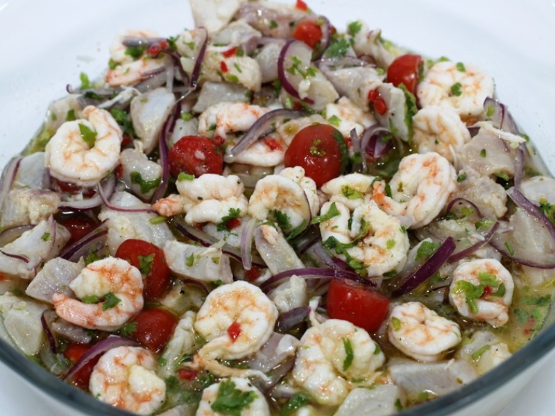 Branquear os camarões colocando em água fervente por 3 minutos e em seguida num recipiente com água gelad e pedras de gêlo por 2 minutos. Escorrer e reservar. Cortar os filés de peixe em cubinhos de 2 cm, colocar em uma tigela funda e juntar os camarões. Temperar com sal e pimenta-do-reino a gosto e deixar por 3 minutos tomando gosto. Após esse tempo , incorporar os sucos de limão e de laranja lima. Deixar por mais 3 minutos marinando. Acrescentar o alho, as cebolas, as pimentas, os tomates, o coentro e as pedras de gelo. Misturar cuidadosamente com o auxílio de 2 colheres por uns 4 minutos. Finalizar com o azeite. Servir acompanhado de milho verde, palitos de batata doce cozidos e conserva de gengibre.