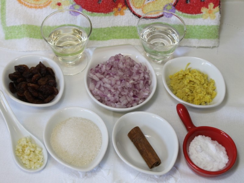 Descascar as mangas e as mação e cortar tudo em cubinhos de 1 cm. Picar as cebolas e os dentes de alho e reservar. Retirar as sementes e a parte branca do pimentão e cortar em cubinhos. Descascar e ralar o gengibre. Em uma panela, colocar esses ingredientes preparados e acrescentar as uvas passas, o sal, o açúcar, a canela, a água e o vinagre. Levar ao fogo e cozinhar em fogo médio, mudando para baixo quando começar a ferver. Tampar e cozinhar por 40 minutos sempre mexendo. Se começar a pegar na panela, acrescentar mais um pouco de água e misturar bem. Tem que ficar com um pouco de caldo, pois ao esfriar, o chatney vai endurecer. Após os 40 minutos, desligar o fogo e tranferir para potinhos de vidro esterelizados. Deixar esfriar e conservar em geladeira por até 3 semanas.