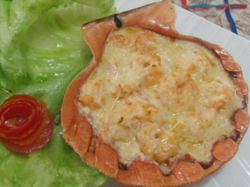 Temperar o camarão com sal e pimenta-do-reino a gosto. Refogar a manteiga na cebola e colocar o camarão. Refogar ligeiramente e acrescentar o vinho. Deixar evaporar um pouco. Juntar o creme de leite e deixar encorpar (mais ou menos por uns 5 minutos). Colocar nas conchas, polvilhar com queijo ralado e levar ao forno para gratinar.