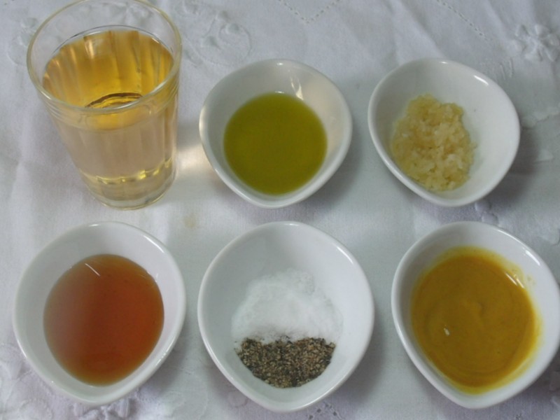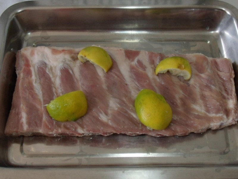 Colocar a costelinha em água com o suco do limão e deixar marinando por no mínimo 1 hora. Escorrer e levar à uma assadeira. Despejar o vinho branco e o azeite sobre ela. Em seguida, temperar com sal e pimenta-do-reino. Besuntar com o mel e a mostarda, cobrir com papel alumínio e levar ao forno aquecido por 1 hora e 15 minutos (parte do osso para baixo). Retirar o papel, regar bem com o molho da assadeira e deixar dourar por aproximadamente 10 minutos. Arrumar a costelinha em uma travessa forrada com alface, regar com o restante do molho e servir com purê de banana da terra.
