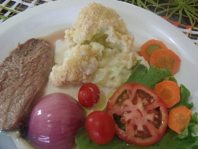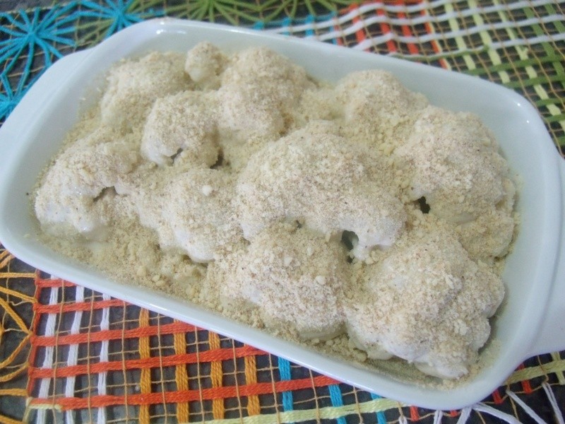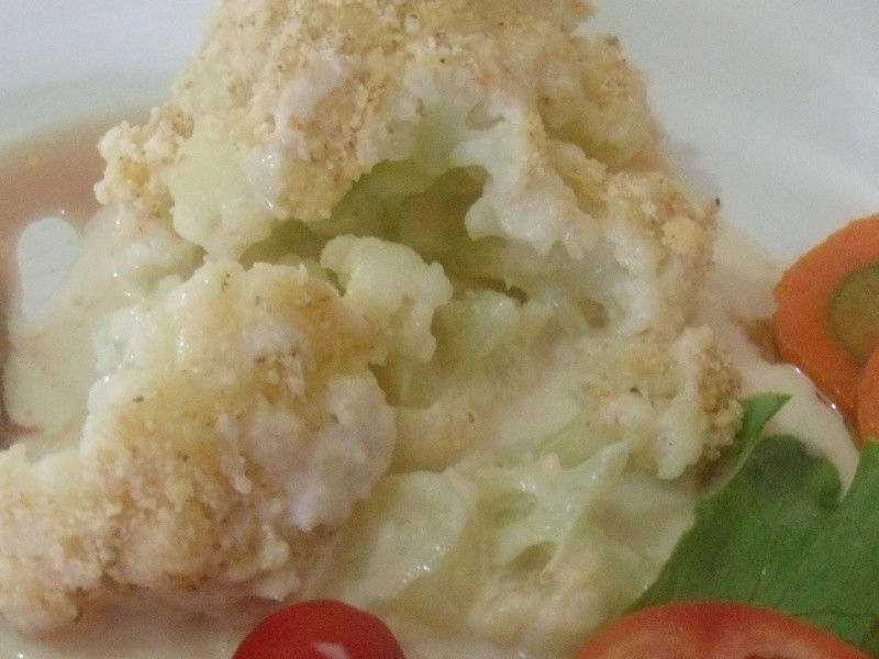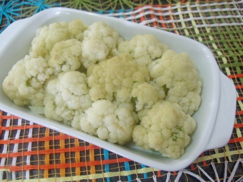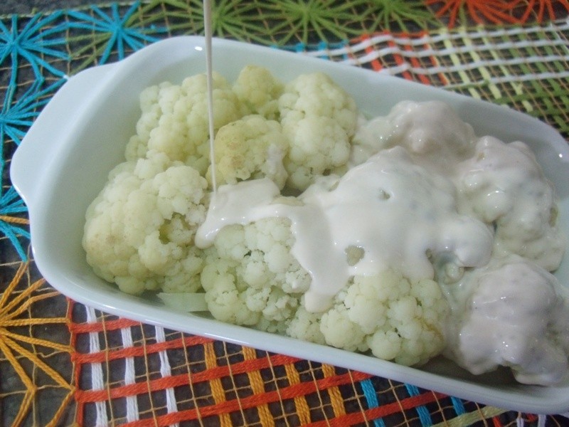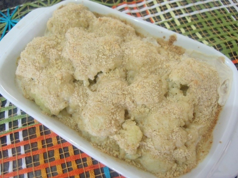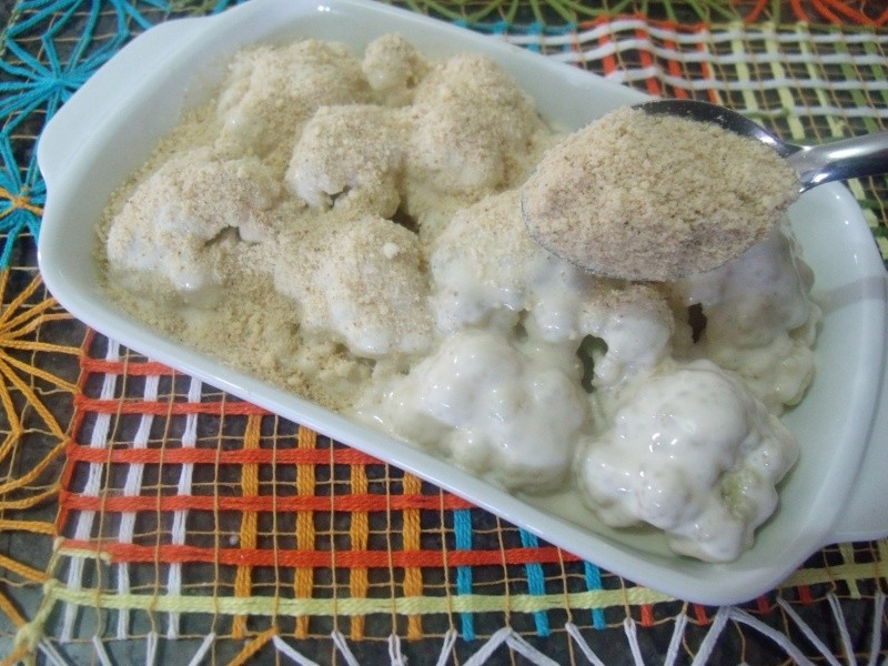 Separar os buquês da couve-flor, lavar e colocar no hipoclorito por 20 minutos. Lavar novamente em água corrente e cozinhar no vapor até ficar macia (crocante). Colocar os buquês em uma travessa, temperar com sal a gosto e cobrir com o molho branco. Misturar o queijo ralado com a farinha de rosca e colocar sobre o molho. Levar ao forno até dourar.