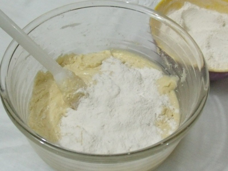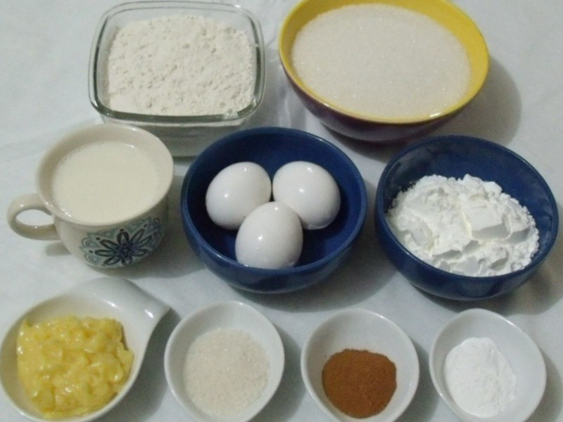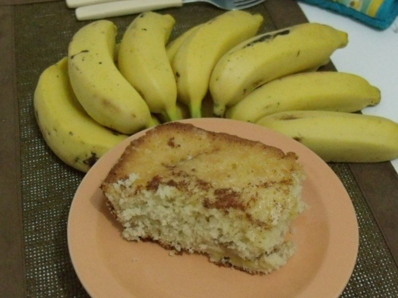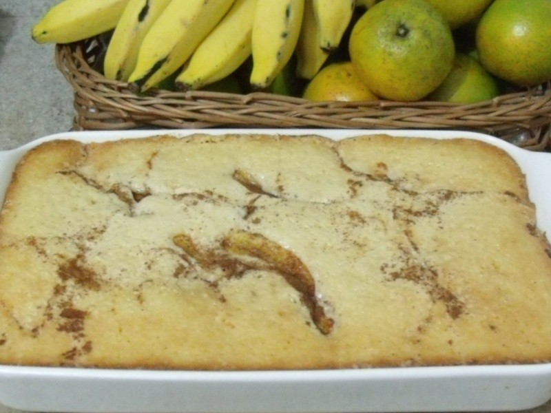 Bater a manteiga com o açúcar e acrescentar as claras em neve. Juntar depois as gemas e aos poucos, as farinhas peneiradas com o fermento em pó, ao tempo em que vai acrescentando o leite. Misturar bem até obter uma massa fina. Untar uma assadeira ou um pirex com manteiga e colocar a massa. Partir as bananas em fatias e cobrir toda a superfície da massa com elas. Polvilhar fartamente com açúcar e canela. Assar em forno brando por aproximadamente 45 minutos (vai depender da potência do seu forno). Deixar esfriar um pouco e servir em fatias largas.