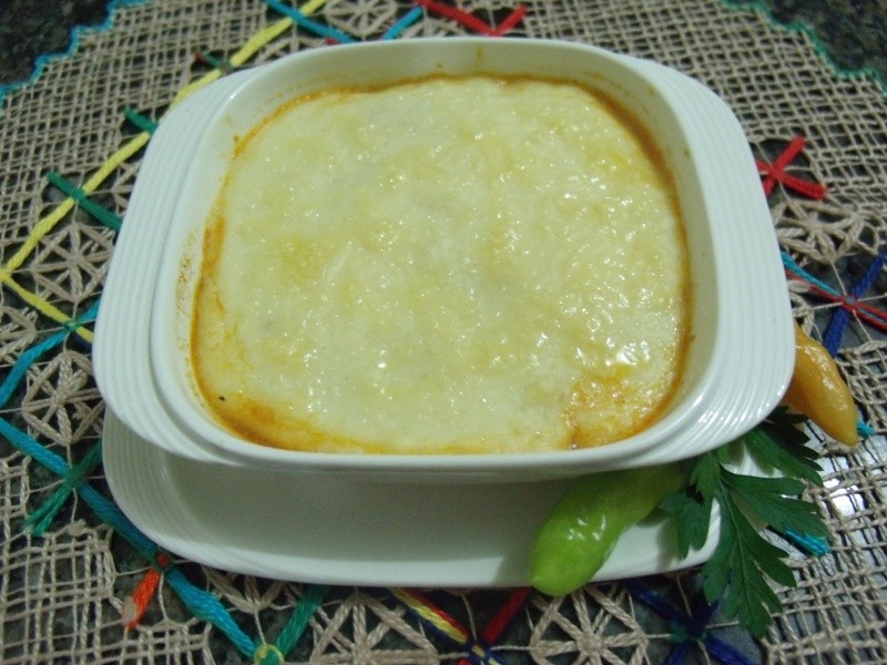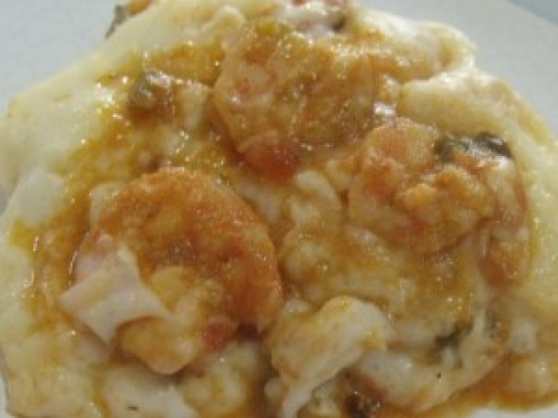 Cozinhar bem a macaxeira em água e sal até ficar desmanchando. Colocar no liquidificador com o leite (sem a água, mas reserve um pouco caso seja necessário) e bater bem até ficar com uma consistência de purê cremoso. Levar ao fogo em uma panela com a manteiga, mexer bem e acrescentar 1 colher (sopa) de queijo ralado. Reservar. Em outra panela, refogar ligeiramente o alho e a cebola no azeite. Acrescentar os tomates, o pimentão e o purê de tomate. Baixar o fogo, tampar a panela e cozinhar bem. Colocar os camarões já lavados com limão e temperados com sal e pimenta-do-reino a gosto, o coentro, a cebolinha e o leite de coco. Cozinhar por aproximadamente 5 min em fogo médio. Dispor em tigelinhas individuais os camarões (de 6 a 8 porções), cobrir cada uma com o purê de macaxeira e polvilhar o restante do queijo ralado. Levar ao forno para gratinar. Decorar a gosto.