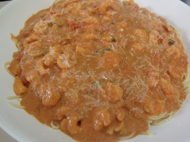 Temperar os camarões com limão e sal a gosto. Selar na manteiga com um fio de azeite, virando-os de um por um. Retirar da frigideira com uma espátula e reservar. Ao caldo que se formou na panela, acrescentar o molho de tomate, o vinho e os tomates pelados partidos grosseiramente. Fritar ligeiramente no azeite os cogumelos e colocar no molho. Juntar os camarões e o manjericão. Por último, o creme de leite, a noz moscada e as raspas do limão (não deixar ferver). Colocar sobre o espaguete cozinhado al dente (récem escorrido) e polvilhar o queijo ralado grosso e folhas de manjericão. Servir imediatamente com queijo ralado à parte.