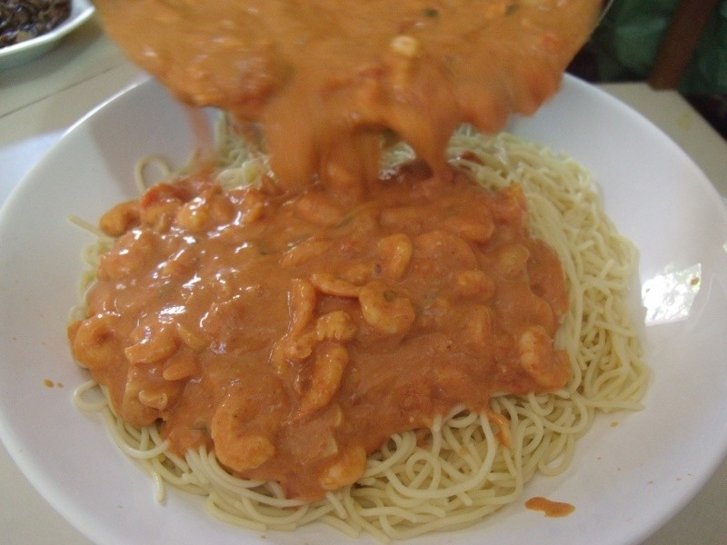 No último domingo, liguei para o meu irmão Fernando Pinto e o convidei para almoçarmos fora. Ele me convençeu a fazermos uma macarronada de camarão na casa dele. Levei manjericão fresco do meu canteiro e um molho de tomate caseiro. Ele é um exímio cozinheiro, e sempre ciscamos juntos na cozinha. Surgiu esse prato de “lamber os beiços”.