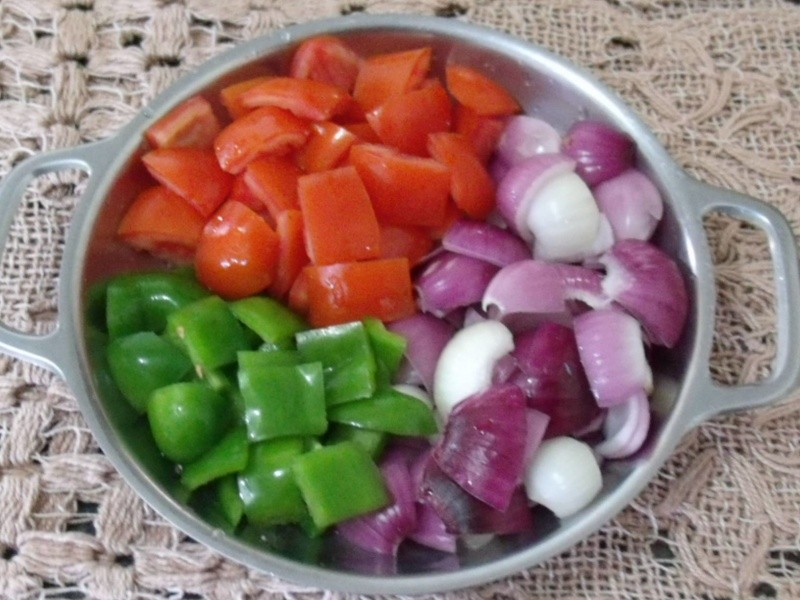 Colocar os espetinhos de madeira de molho na água por 30 minutos, para que eles não queimem quando colocados na brasa. Temperar os cubos de carne com pimenta-do-reino, cominho, alho, colorau e óleo de soja. Reservar. Cortar os tomates, as cebolas e o pimentão em cubos e começar a montar os espetinhos. Colocar primeiro um cubo de carne, um pedaço de cebola, um de tomate e um de pimentão. Ao todo, colocar 4 pedaços de carne, ou menos se preferir. Fazer alguns sem pimentão, outros sem cebola e ainda, outros apenas de carne, para atender à todos os gostos. Levar à churrasqueira bem perto da brasa para que eles fiquem bem dourados por fora e suculentos por dentro. O ponto de mal ou bem passado fica “ao gosto do freguês”.