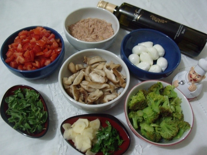 Levar ao fogo uma panela com 5 litros de água com um pouco de sal e um fio de óleo. Quando levantar fervura, adicionar a massa e cozinhar por aproximadamente 10 minutos. Regar com um fio de azeite e reservar. Em uma panela grande (usei uma wok), colocar o azeite e refogar ligeiramente o alho fatiado. Acrescentar os cogumelos, refogar mais um pouco e incorporar o vinho branco seco. Baixar o fogo para cozinhar os cogumelos (mais ou menos 10 minutos) e em seguida adicionar os brócolis, os tomates e o atum. Desligar o fogo e colocar as folhas de rúcula, as de mangericão e a mussarela de búfala. Mexer com cuidado e acrescentar a massa reservada. Misturar cuidadosamente e levar à uma travessa apropriada. Regar com azeite extra virgem e polvilhar com o queijo ralado. Servir imediatamente!