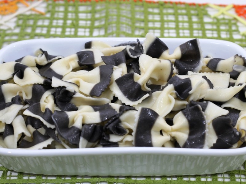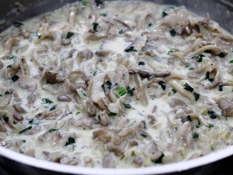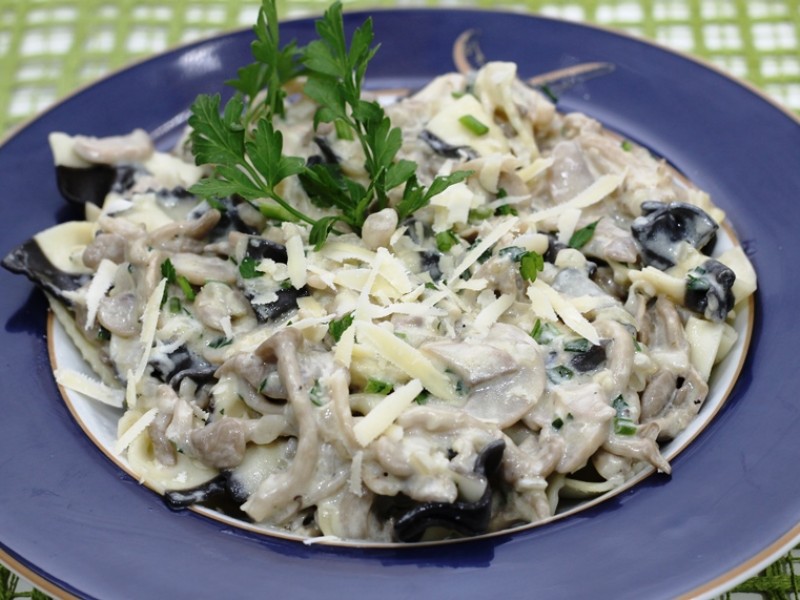 Cortar os cogumelos Paris em fatias e reservar. Cortar as bases do Shimeji, soltar os cachinhos e reservar. Levar ao fogo uma frigideira com azeite e manteiga e refogar a cebola e o alho. Acrescentar os cogumelos, refogar em fogo médio mexendo sempre por uns 5 minutos ou até que estejam dourados e macios. Colocar o vinho branco e deixar evaporar. Temperar com sal e pimenta-do-reino a gosto, misturar bem e introduzir a salsinha picada e o creme de leite. Escorrer o farfalle e colocar o molho de cogumelos por cima. Envolver o molho na massa com a ajuda de dois garfos. Polvilhar queijo ralado grosso e servir imediatamente.