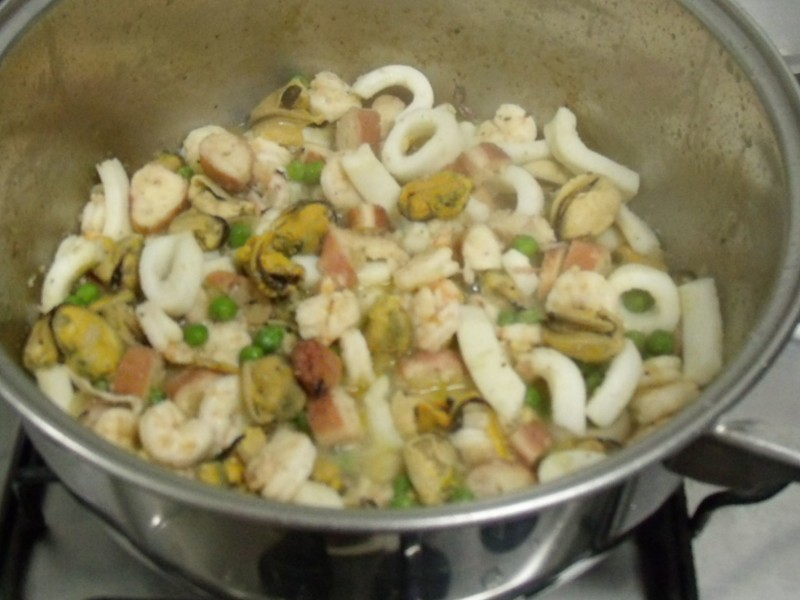 Cozinhar a massa em bastante água fervendo (4 litros), deixando-a "al dente". Enquanto isso, colocar os anéis de lula em uma frigideira por 5 minutos mexendo sempre. Escorrer e reservar. Levar ao fogo uma panela com azeite, refogar o alho e a cebola. Acrescentar os mexilhoões e refogar para que ele solte a sua água. Incorporar o vinho branco e deixar evaporar por uns 5 minutos. Em seguida, acrescentar o polvo cozido, os anéis de Lula cozidos, os camarões branqueados , a ervilha fresca, o molho de tomate, o caldo de camarão e o açafrão. Refogar por 5 minutos, temperar com sal e pimenta-do-reino e colocar o cheiro verde (cebolinha e coentro ou salsinha) . Escorrer a massa, colocar em pratos individuais e despejar uma concha do molho de frutos do mar sobre cada um. Polvilhar queijo parmesão ralado grosso (ou lascas) e regar com azeite extra virgem. Acompanhar de um bom vinho de sua preferência.