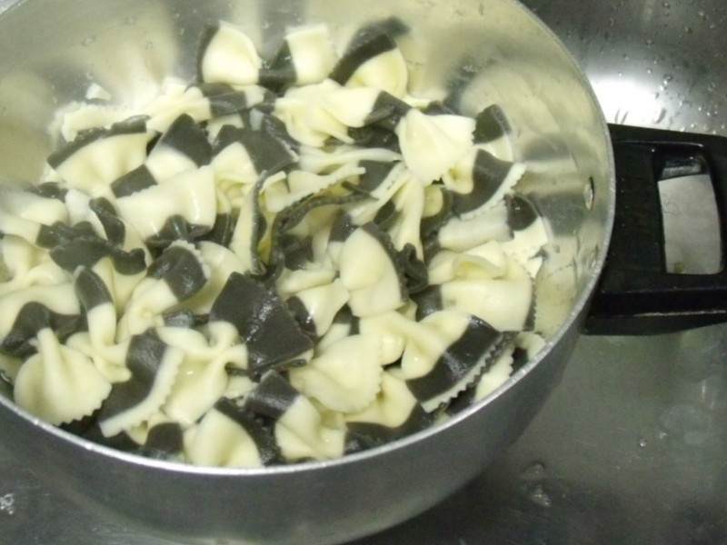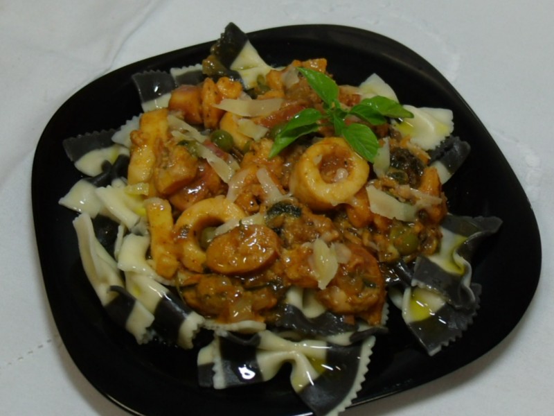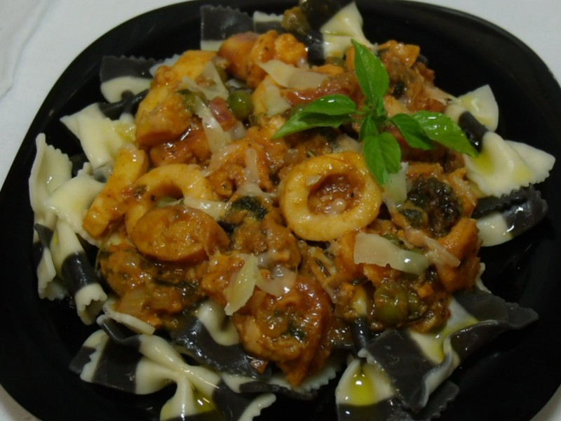 Esta receita fez o maior sucesso, pois além de muito gostosa, ficou com um visual incível! Massa e frutos do mar fazem um casamento perfeito! Para facilitar, costumo preparar alguns ingredientes com antecedência, como o cozimento do polvo, levando-o ao fogo em uma panela de pressão com um pouco de água, colocando 1 cebola para cada k. de polvo. Escorrer, cortar em rodelas e reservar. Os camarões depois de limpos, sáo colocados em água fervente (fora do fogo) por 2 minutos e logo após, em um recipiente com água gelada e bastante gelo por mais 2 minutos. Escorrer e reservar. Preparo também o molho de tomate caseiro de vérpera para ganhar tempo. O que posso dizer é que vale a pena o trabalho, pois o resultado final é um prato delicioso e de um sabor indescritível!