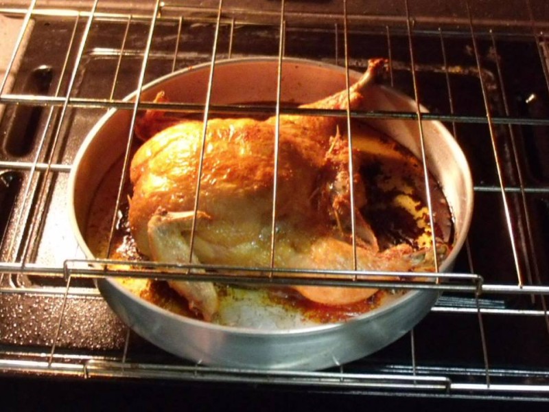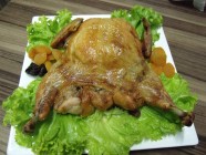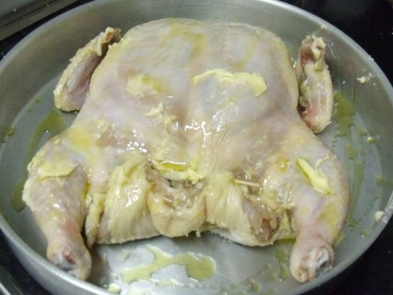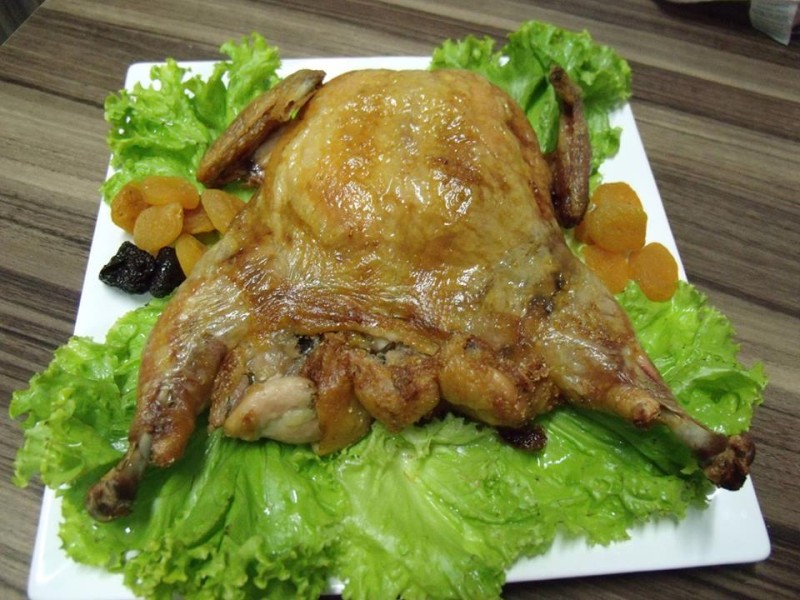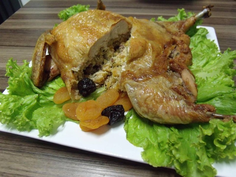 Levar ao fogo uma panela com o azeite e a manteiga. Refogar o bacon e em seguida o alho e a cebola até que esta fique transparente. Incorporar as azeitonas, a cenoura e os damascos. Refogar um pouco e acrescentar o cheiro verde, as castanhas e os ovos cozidos. Em seguida, a farinha de mandioca. Mexer bem por uns 2 minutos e está pronta a sua farofa. Rechear um frango desossado, temperado apenas com sal e besuntar com manteiga e azeite. Levar ao forno por 1 h e 40 minutos. Decorar com alface, damasco e ameixas e servir acompanhado de arroz refogado e um bom vinho.