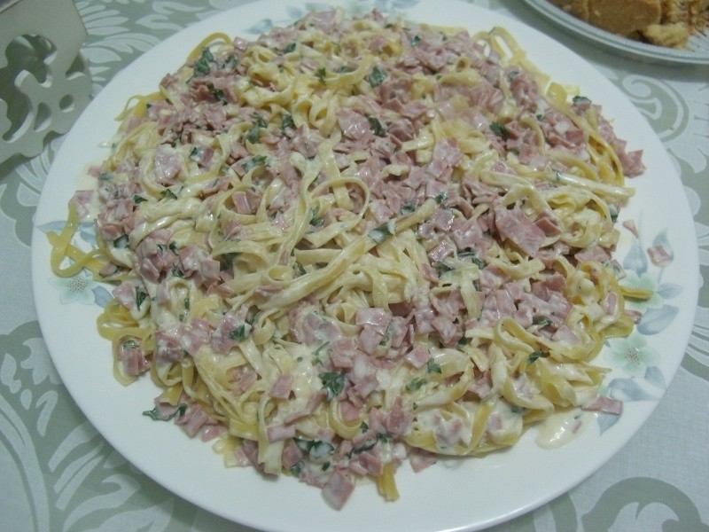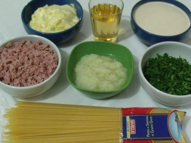 Cozinhar o fettuccine, conforme as instruções da embalagem. Enquanto isso, levar ao fogo a manteiga e refogar as cebolas. Acrescentar o presunto, refogar um pouco e colocar agora o vinho e a salsinha. Deixar o vinho evaporar um pouco e incorporar o creme de leite sem ferver. Em uma travessa, colocar a metade do fettuccini e cobrir com metade do molho. Revolver com dois garfos para incorporar bem. Colocar por cima a outra metade da massa e o restante do molho. Proceder da mesma maneira com os garfos. Servir imediatamente, com queijo ralado à parte.