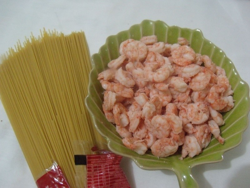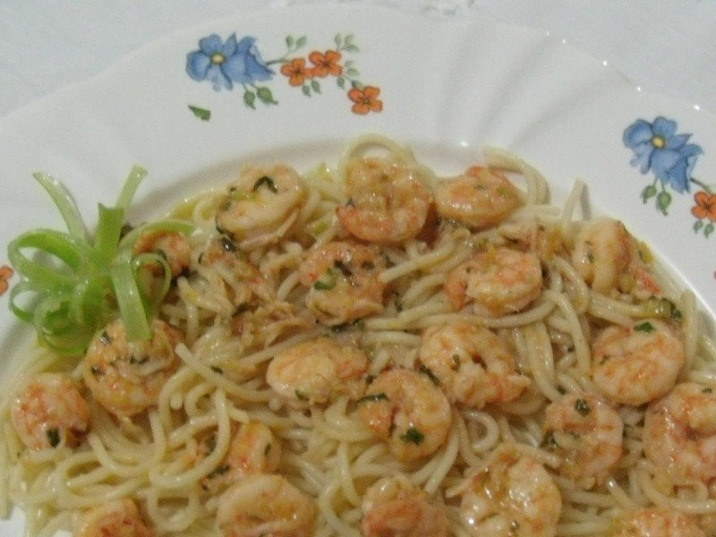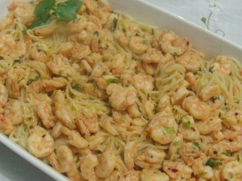Nota: o ideal é que a massa fique pronta junto ao camarão. Aqui utilizei camarões cozidos que tinha em casa , mas prefiro os frescos, que ficam mais macios quando são preparados na hora. Se quiser fazer com camarões grandes, parta-os ao meio no sentido do comprimento, para que eles incorporem melhor à massa.