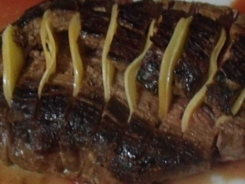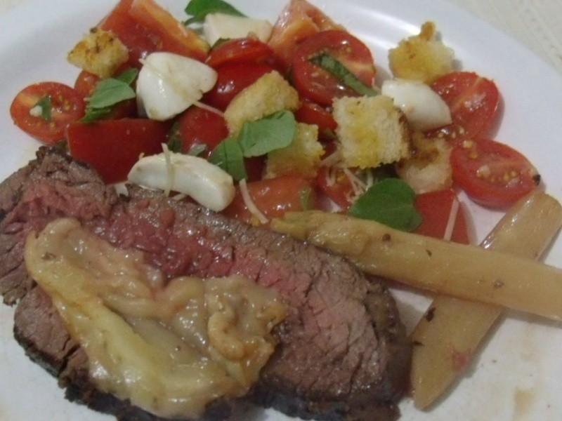Esse filé estava temperado, aguardando a minha chegada do supermercado! Vi esse provolone defumado em rodelas finas e logo pensei em como ele casaria bem com o meu filé! Ficou simplesmente delicioso! Meu filho e meu irmão adoraram! Acompanhei de aspargos na manteiga e salada de tomates variados! A simplicidade do filé é tudo de bom!